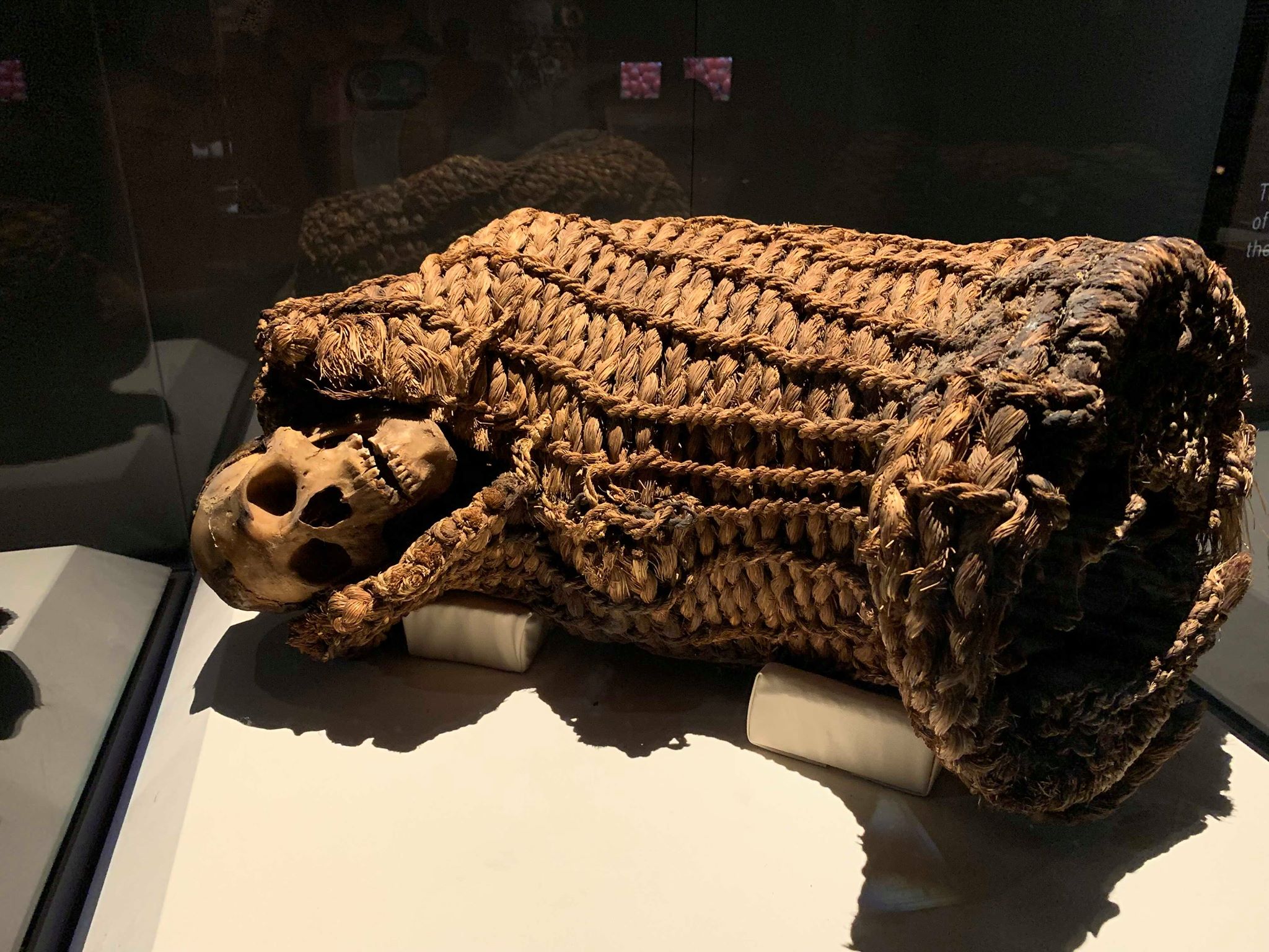 The Mummies from South America section includes Incan bundle mummies. Instead of the mummies in the typical laying posture, the bundles mummies were bound tight in fetal positions and wrapped in grass cords, creating a small bundle.