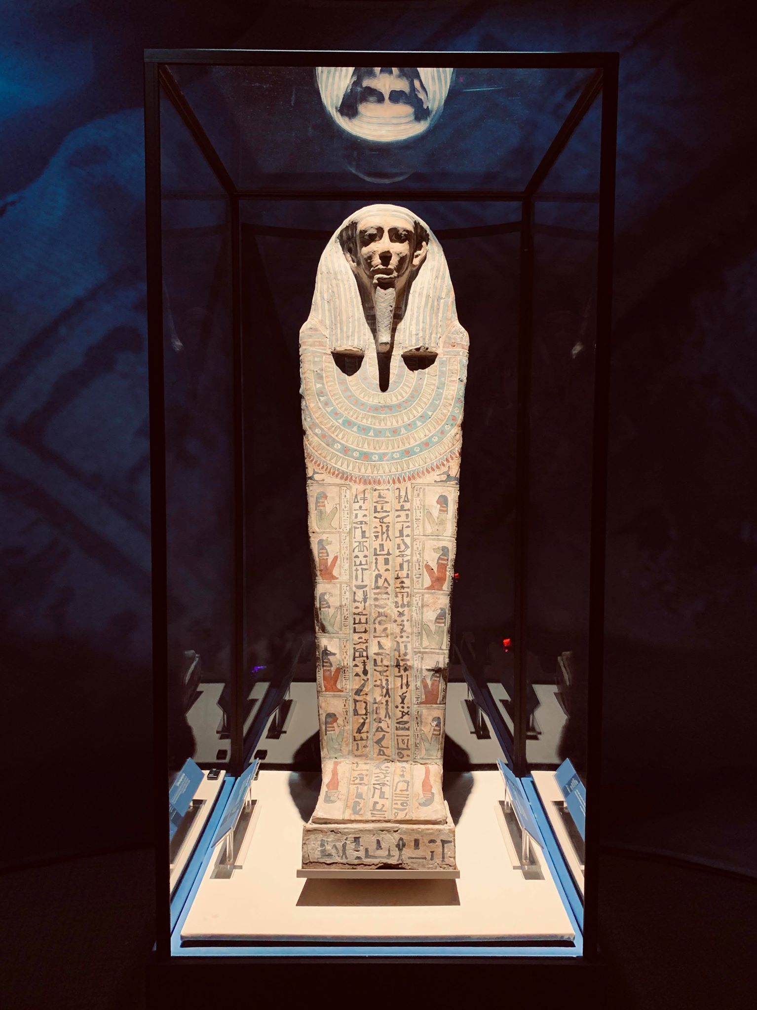 Highlights from the exhibit include the mummy of Nes-Min, an Egyptian priest from the temple of Min. What makes Nes-Min unique from other Egyptian mummies is what’s peeking out from beneath his wrappings. In Egyptian mummification, all organs were removed, except for the heart. A scarab beetle would be placed over the heart during the mummification procedure. In Nes-Min’s case, he has an extra scarab beetle placed in the top of his skull. Visitors are able to see the scarab and the intricate wrappings and sarcophagus of Nes-Min, as well as the mummy of another priest from the temple Min, Nes-Hor.